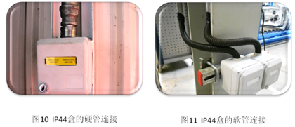 就圖10而言,IP44塑料安裝盒與金屬硬管呈硬連接狀態(tài),兩者之間必然存在著應(yīng)力,時(shí)間長了在應(yīng)力的作用下塑料盒會(huì)開裂,最終會(huì)導(dǎo)致盒體破損。為了避免這樣的事件發(fā)生,就應(yīng)該采用圖11所示的連接方式,墻面上敷設(shè)的是采用金屬電線管,通過技術(shù)軟管轉(zhuǎn)接后連接到IP44安裝盒上,利用金屬軟管的緩沖,確保連接處沒有應(yīng)力存在,確保了盒體能夠長期、可靠的使用。