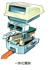 一體化模塊的示意圖參見右圖。它的特點(diǎn)是塑料面板僅為裝飾品,一個(gè)鑄造的殼體中包含有左右兩個(gè)螺絲安裝孔。由于金屬帶有延展性,即使殼體變形也不會(huì)導(dǎo)致其中的RJ45口模塊掉下來。當(dāng)面板安裝完畢后,即使外力將面板撞裂,將僅僅只是美觀上受影響,不會(huì)出現(xiàn)常規(guī)面板碎裂后模塊脫落無法使用的現(xiàn)象。