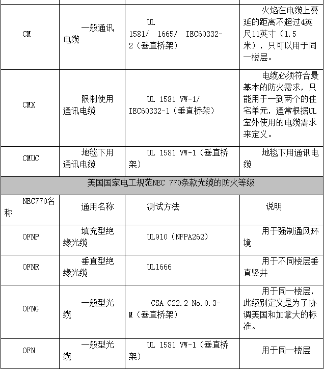 有些資料上介紹IEC 60332.1等同于UL的CM級要求(IEC 60332.2是細徑纜線的測試方法,即不能使用60332.1測試時使用的替代測試方法)、IEC 60332.3C等同于UL的CMR級要求。事實上,這4個標準的測試方法并不相同,無法直接對比。因此,對于上述說法只能姑且聽之。