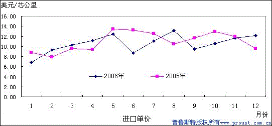 月 份 | 進(jìn)口量(萬芯公里) | 金額(萬美元) | 單價(jià)(美元/芯公里) |