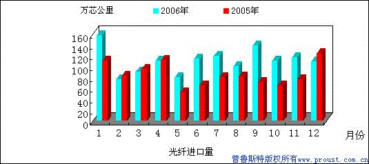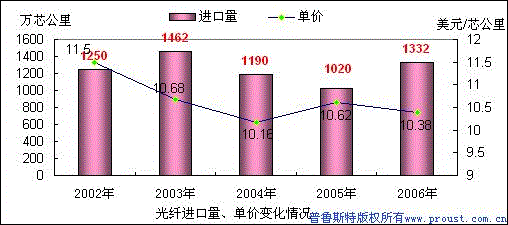 根據(jù)產(chǎn)業(yè)損害預(yù)警系統(tǒng)監(jiān)測,2006年全國光纖累計(jì)進(jìn)口(稅則號(hào)90011000,下同)1331.88萬芯公里,比去年同期1020.89萬芯公里,增長30.46%。進(jìn)口金額13824.5萬美元,同比增長27.52%。全年平均進(jìn)口單價(jià)為10.38美元/芯公里,比上年同期平均單價(jià)10.62美元/芯公里下降了2.26%。