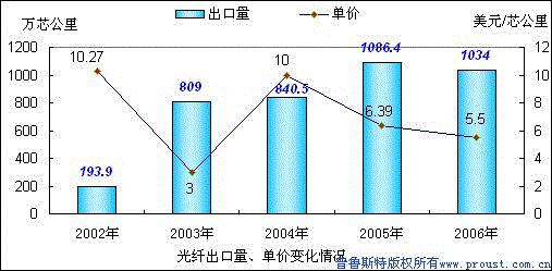 2006年光纖進(jìn)口達(dá)到1331.88萬芯公里,是2002年以來僅次于2003年的第二多年份,進(jìn)口單價(jià)處于同期次低水平,與2005年相比,2006年光纖進(jìn)口量增價(jià)跌。出口量由于國內(nèi)需求的旺盛,比2005年下降了4.84%。