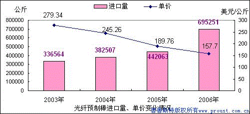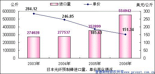 根據(jù)自2003年至2006年光纖預(yù)制棒進(jìn)口量和單價(jià)數(shù)據(jù)的分析,該產(chǎn)品的量增價(jià)跌現(xiàn)象十分明顯,應(yīng)引起有關(guān)部門和國內(nèi)預(yù)制棒生產(chǎn)企業(yè)的高度重視。