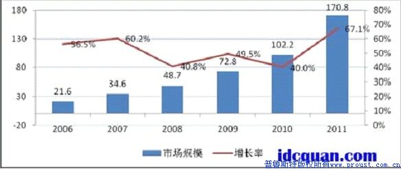 2006-2011年中國(guó)IDC市場(chǎng)規(guī)模及增長(zhǎng)